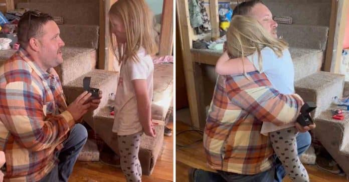 Esse foi o caso de uma gravação compartilhada por uma mãe chamada Taylor Nally, que recentemente ficou noiva de Michael, seu parceiro. Michael, entretanto, não estava satisfeito com isso e sentiu que também tinha uma pergunta muito importante a fazer a Charlie, a filha de 9 anos de sua namorada.