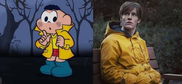 Sempre antenada em tudo o que acontece de mais relevante na cultura pop, a Turma da Mônica resolveu prestar uma divertida homenagem à série Dark, da Netflix, novo vício dos assinantes da plataforma. Em uma arte inédita divulgada em sua conta no Twitter, a MSP vestiu Cascão como o personagem Jonas Kahnwald (Louis Hofmann), protagonista da série alemã, com direito à clássica capa de chuva amarela.