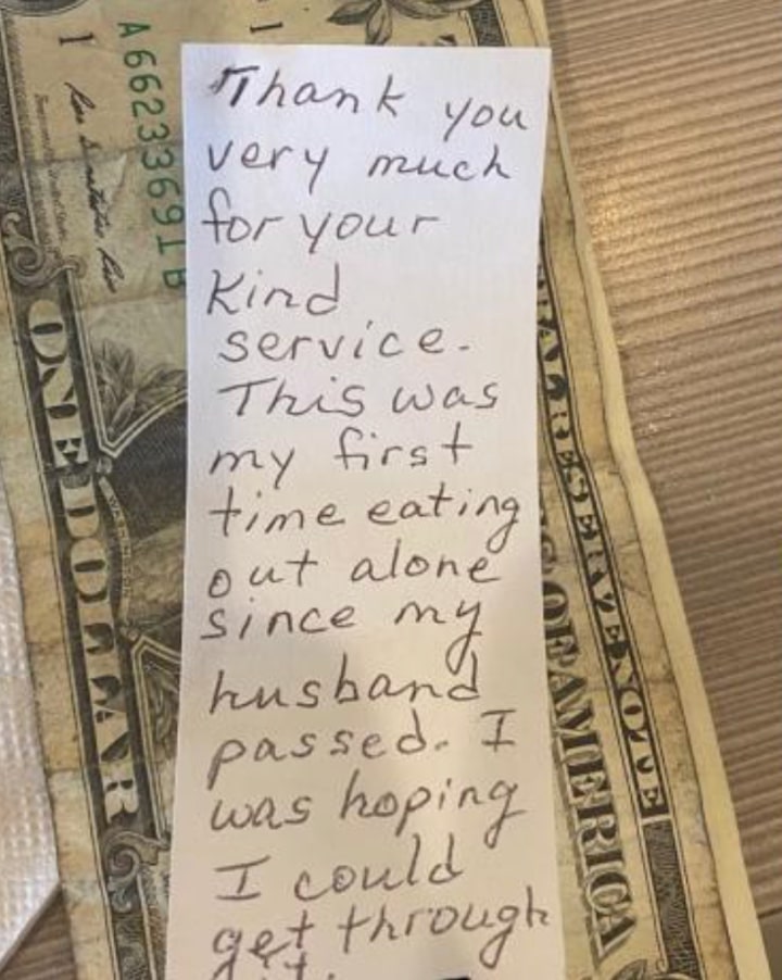 A garçonete, depois de sua pequena conversa, voltou para seus deveres e continuou seu dia. Quando voltou a mesa para retirar os pratos que faltavam, encontrou a gorjeta que havia sido deixada para ela. Junto com a gorjeta, entretanto, havia um pequeno pedaço de papel que levou a garçonete às lágrimas.