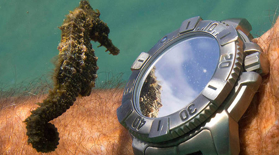 Nesta imagem notável, um cavalo marinho verifica seu reflexo em um relógio de mergulho. Dada a luminosidade da imagem e o reflexo das nuvens, a imagem certamente foi tirada bem próxima à superfície.