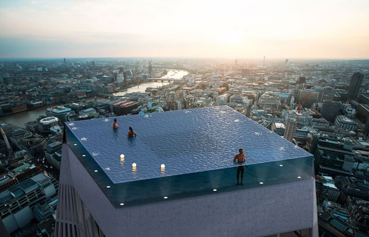 O projeto foi anunciado por uma empresa chamada Compass Pools. O Infinity London será o primeiro e único edifício do mundo a incorporar este design de piscina de última geração. A piscina será colocada em cima de um arranha-céu de 55 andares e permitirá que as pessoas flutuem mais de 200 metros acima do horizonte de Londres, com vistas panorâmicas da cidade.