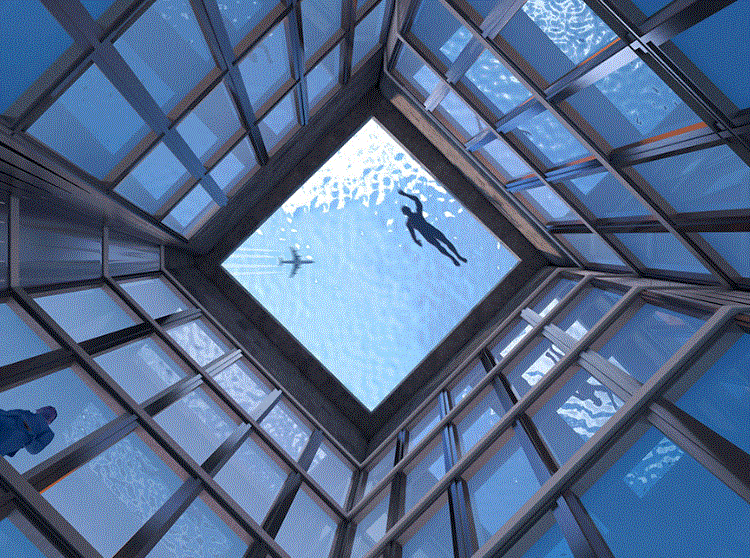 “Arquitetos geralmente vêm até nós para projetar piscinas de borda infinita no telhado, mas raramente conseguimos opinar sobre o projeto do prédio porque a piscina é normalmente uma reflexão tardia”, disse o diretor técnico Alex Kemsley. “Mas neste projeto, nós começamos com o design da piscina e essencialmente dissemos: ‘Como colocamos um prédio embaixo disso?’