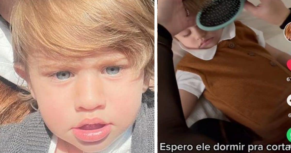 Mari explicou que o pequeno não deixa mais cortar o cabelo, por isso, espera que ele adormeça para cortar as pontas de sua franja.