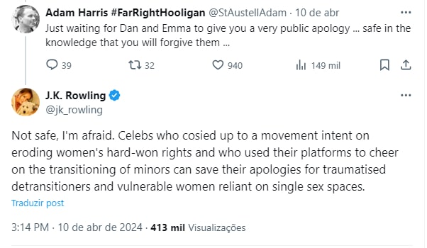 No X, antigo Twitter, um dos seus seguidores de Rowling respondeu a um post dela, dizendo: “Estou só esperando por Dan [Daniel Radcliffe] e Emma [Watson] para se desculparem com você publicamente… Tenho certeza de que você vai perdoá-los…”