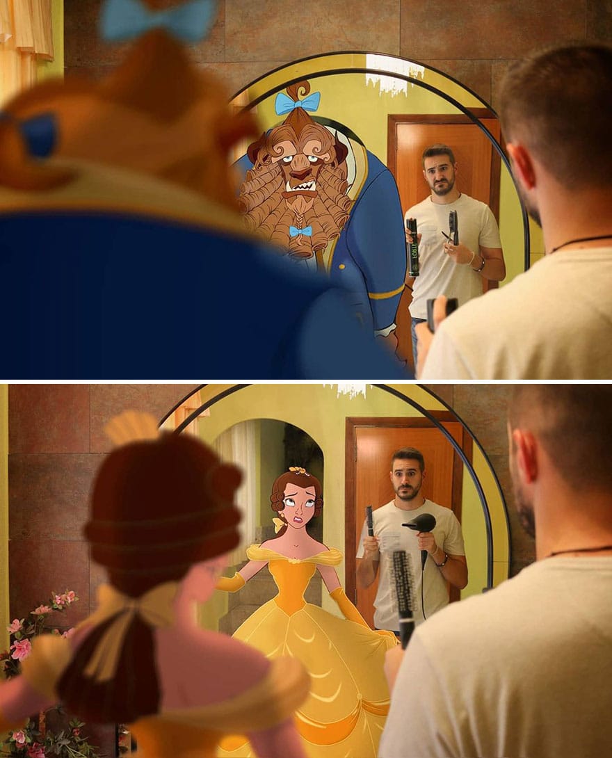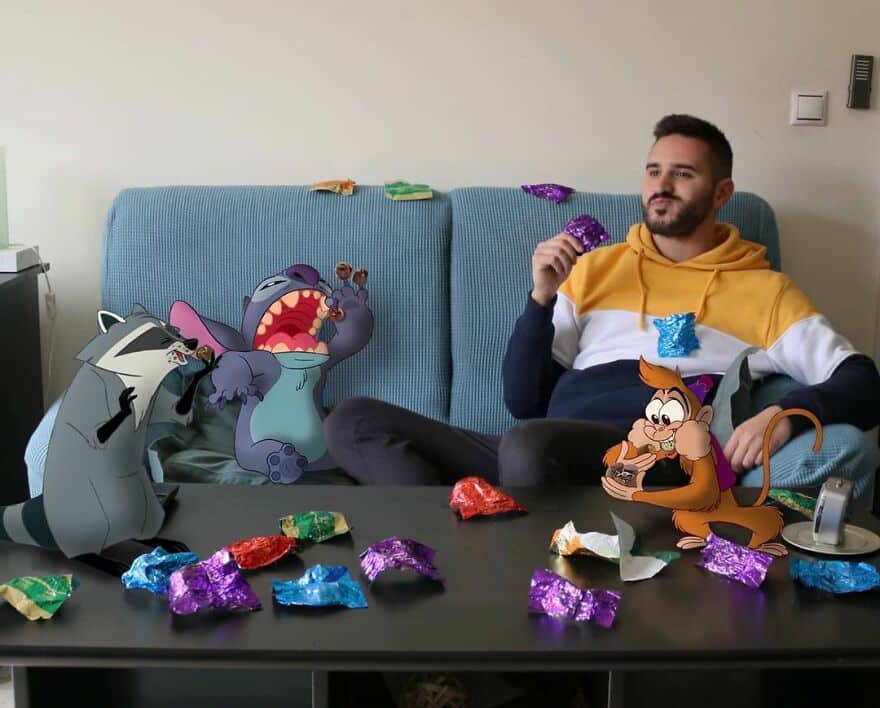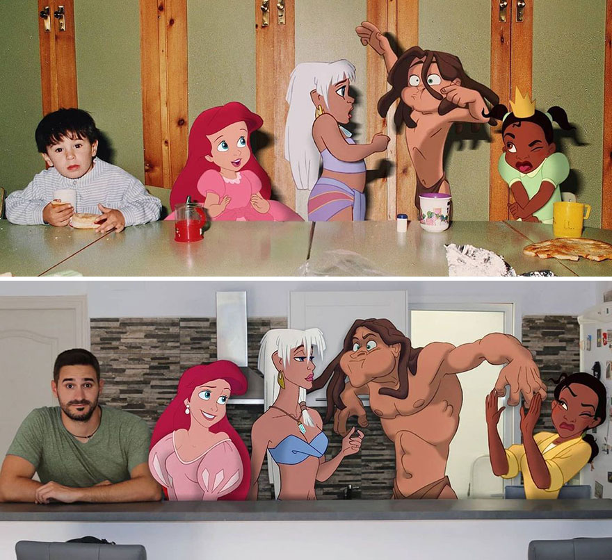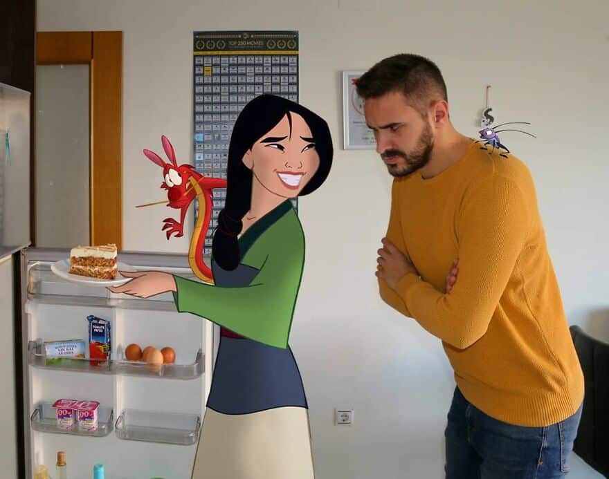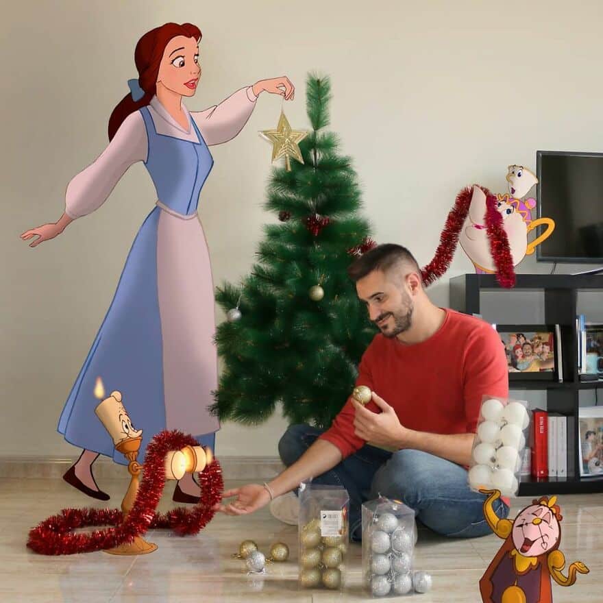 Samuel, que é ator e professor de escola primária, insere personagens icônicos da Disney em sua vida cotidiana usando o Photoshop. E o resultado é tão divertido quanto impressionante. Parece que eles estão realmente interagindo.