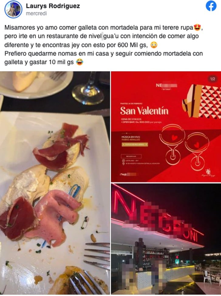 “Meus amores, eu adoro comer pão com mortadela, mas ir a um restaurante de luxo com a intenção de comer algo diferente e encontrar de novo por 600 mil gs. Prefiro ficar em casa e continuar comendo mortadela com biscoito e gastar 10 mil (1 dólar)”, questionou em sua conta no Facebook.