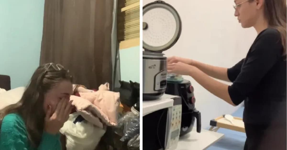 No minúsculo espaço onde vive, Beatriz dispõe de uma cozinha improvisada. Em um vídeo postado em seu perfil no TikTok, ela mostra o passo a passo para preparar o jantar.