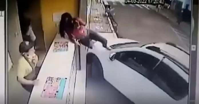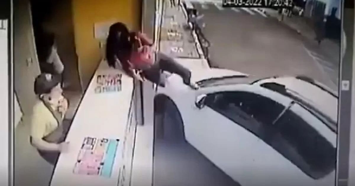 No entanto, assim que o carro se aproximou, a jovem conseguiu colocar os pés sobre o veículo, apoiar-se no balcão e pular, escapando sem nenhum ferimento e levando em mãos seu celular e a bebida.