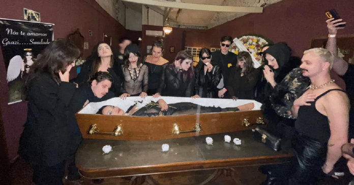 Ela conta ainda Grazi que toda a festa foi minuciosamente planejada por ela. “Fechei um lugar só para o evento. O caixão é alugado, o restante das coisas foram compradas. Tenho vários amigos do audiovisual que me ajudaram com objetos de cena.”. No total, Grazi desembolsou cerca de R$2 mil entre o caixão, onde posou para fotos, e outras decorações, como coroa de flores e uma placa, que dizia: “Nós te amamos, Grazi, saudades.”