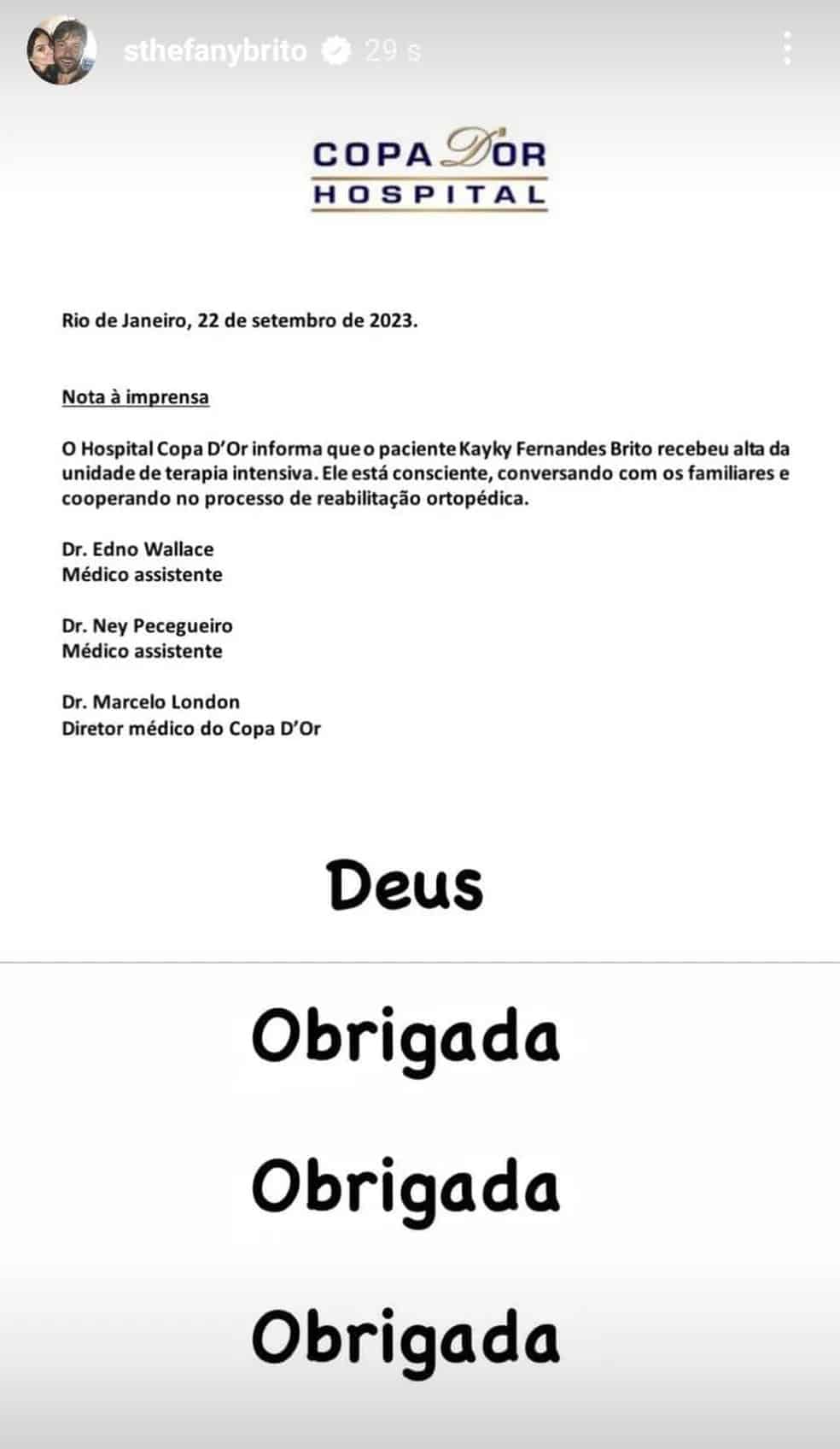 A irmã de Kayky, Sthefany Brito, compartilhou o boletim hospitalar e expressou sua gratidão, escrevendo: “Deus, obrigada, obrigada, obrigada”.