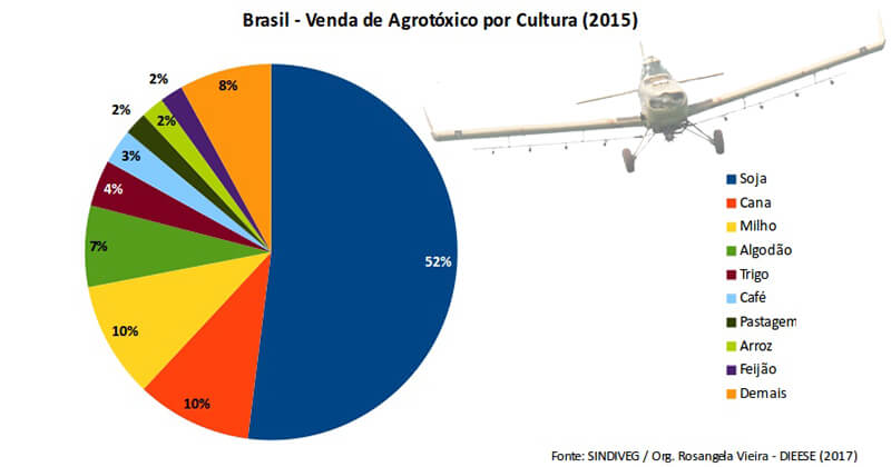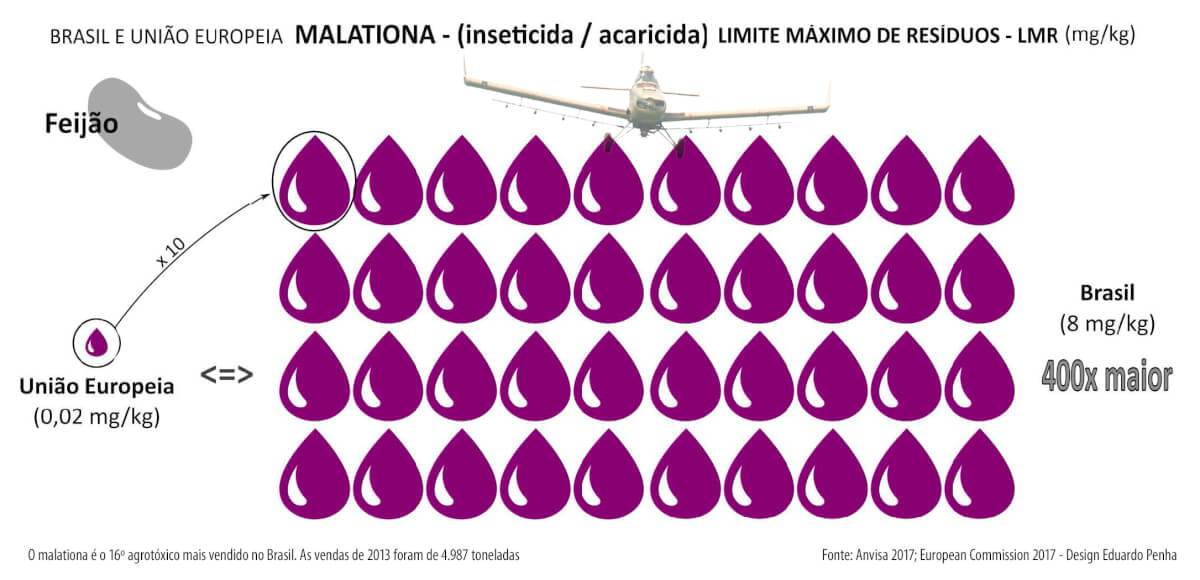 O Brasil é campeão mundial no uso de pesticidas na agricultura, alternando a posição dependendo da ocasião apenas com os Estados Unidos. O feijão, a base da alimentação brasileira, tem um nível permitido de resíduo de malationa (inseticida) que é 400 vezes maior do que aquele permitido pela União Europeia; na água potável brasileira permite-se 5 mil vezes mais resíduo de glifosato (herbicida); na soja, 200 vezes mais resíduos de glifosato, de acordo com o estudo, que é rico em imagens, gráficos e infográficos. “E como se não bastasse o Brasil liderar este perverso ranking, tramita no Congresso nacional leis que flexibilizam as atuais regras para registro, produção, comercialização e utilização de agrotóxicos”, relata Larissa.