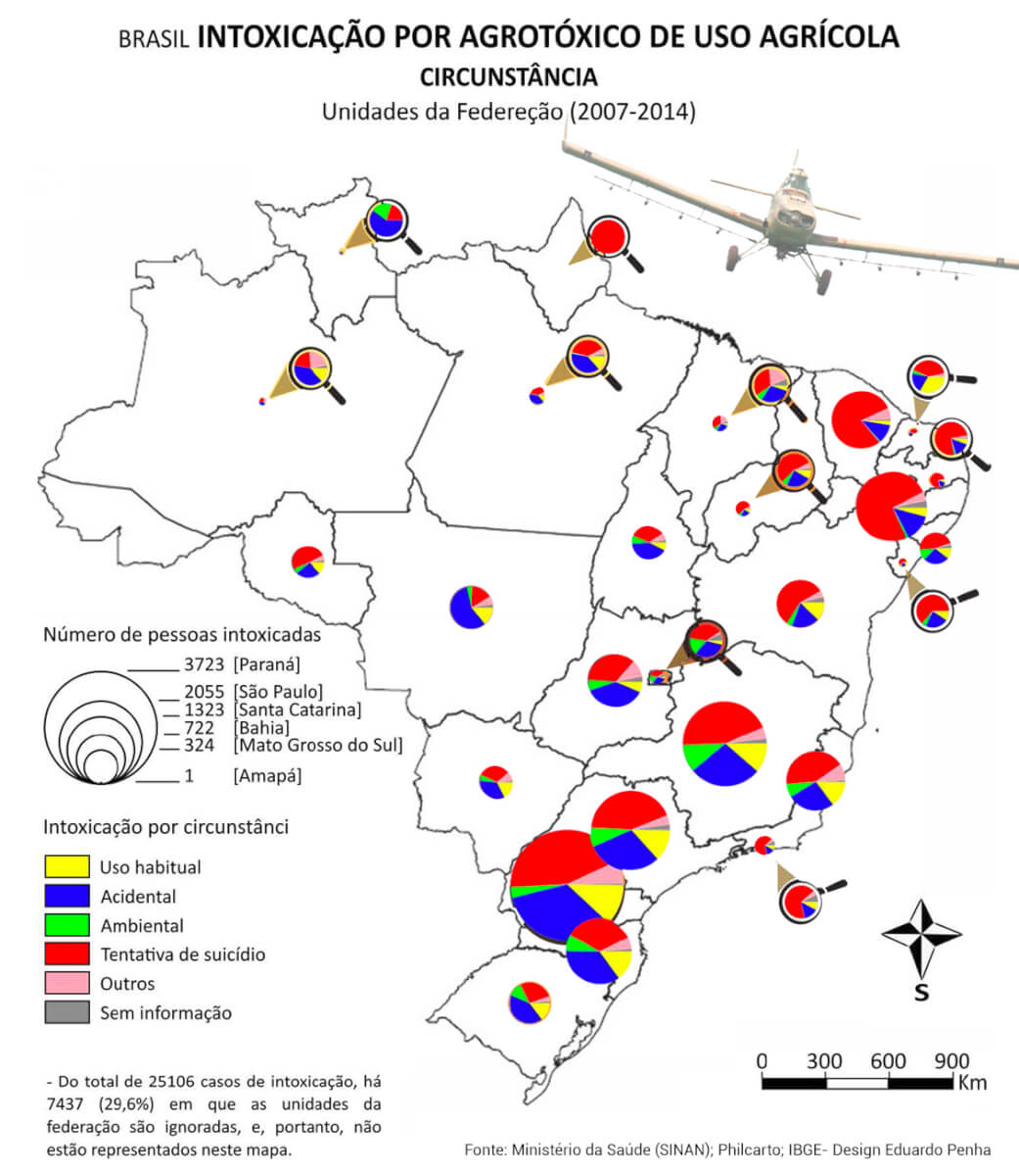 Entre 2007 e 2014, o Ministério da Saúde teve cerca de 25 mil ocorrências de intoxicações por agrotóxicos. O atlas mapeia as regiões mais afetadas: dos Estados brasileiros, durante o período da pesquisa, o Paraná ficou em primeiro lugar, com mais de 3.700 casos de intoxicação. São Paulo e Minas Gerais ficaram na segunda colocação, com 2 mil. Das 3.723 intoxicações registradas no Paraná, 1.631 casos eram de tentativas de suicídio, ou seja, 40% do total. Em São Paulo e Minas gerais o porcentual foi o mesmo. No Ceará, houve 1.086 casos notificados, dos quais 861 correspondiam a tentativas de suicídio, cerca de 79,2%. Os mapas de faixa etária mostram que 20% da população afetada era composta de crianças e jovens com idade até 19 anos. Segundo Larissa, no Brasil, há relação direta entre o uso de agrotóxicos e o agronegócio. Em 2015, soja, milho e cana de açúcar consumiram 72% dos pesticidas comercializados no País.