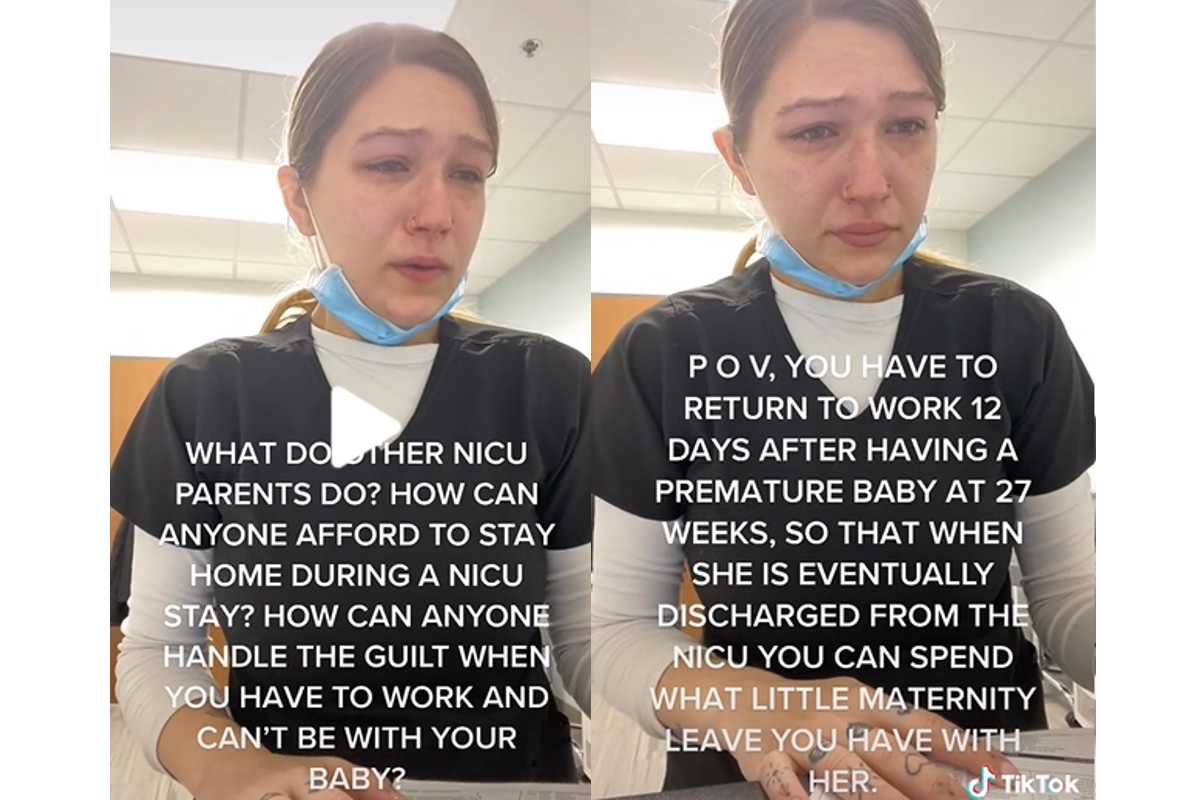 Rebecca Shumard, que mora na Pensilvânia, deu à luz a filha Eden às 27 semanas. Ela voltou ao trabalho 12 dias depois porque queria economizar sua licença não remunerada para poder passar um tempo com a filha depois que a recém-nascida sair da UTIN. Shumard, uma assistente médica, compartilhou o vídeo de si mesma, vestida de uniforme, chorando por causa da situação.