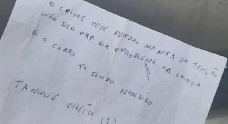 Segundo Rosy, o bilhete deixado pelo ladrão foi encontrado pela equipe policial durante averiguação dentro do carro para saber se havia droga ou algo ilícito. No bilhete estava escrito: “O crime pede perdão. Na hora da tensão, não deu pra ver o problema da criança e o carro tá sendo devolvido. Tanque cheio!”.