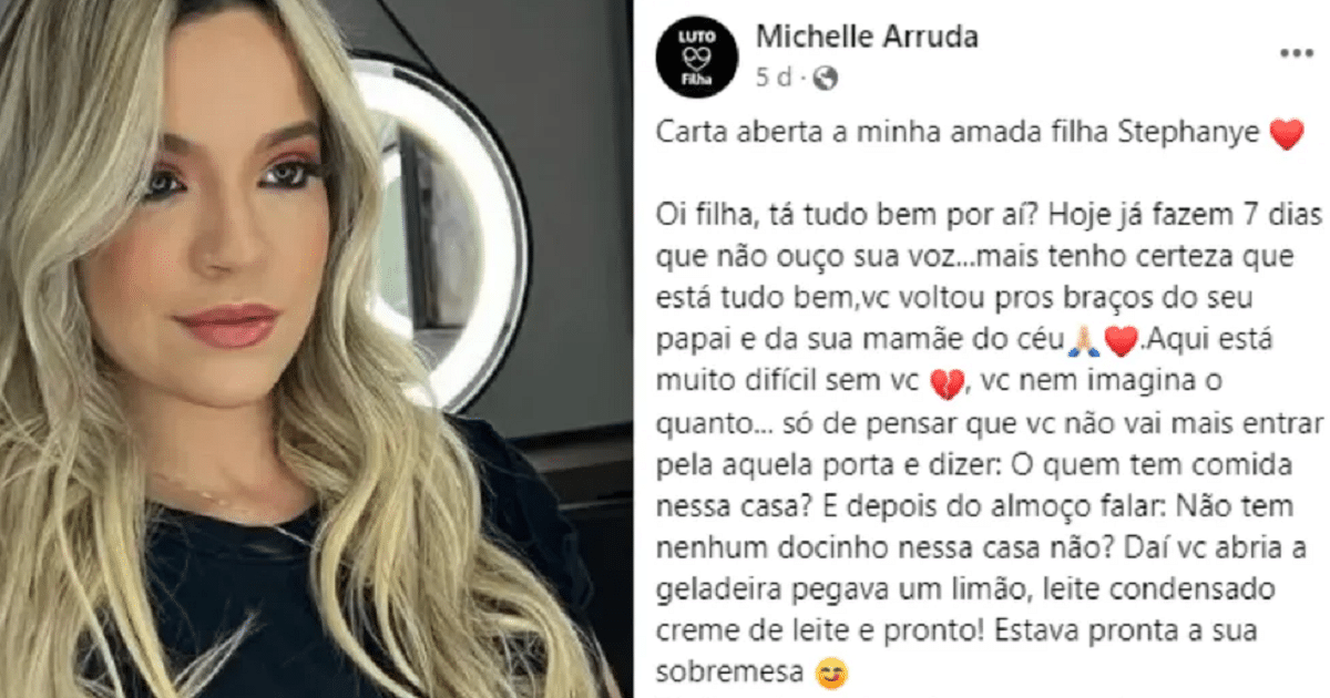 A mãe da jovem Stephanye Oliveira, de 24 anos, que faleceu após o carro em que ela estava ser esmagado por duas carretas na Via Anchieta, em Cubatão (SP), levou muita gente às lagrimas ao compartilhar uma carta de despedida para a filha. No texto publicado nas redes sociais, Michelle Arruda ressaltou que todos amam Stephanie eternamente e que um dia, ‘se Deus quiser’, elas irão se encontrar.