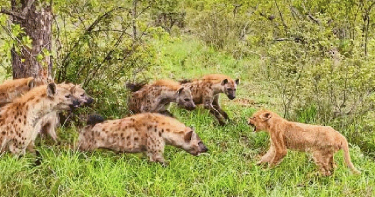 Inicialmente, os felinos pareceram indiferentes à presença dos rivais, mas a situação mudou drasticamente quando um dos filhotes, assustado, saltou da árvore na tentativa de escapar do iminente perigo das hienas. O pequeno leão, agora vulnerável no chão, foi prontamente cercado pelos agressivos predadores.