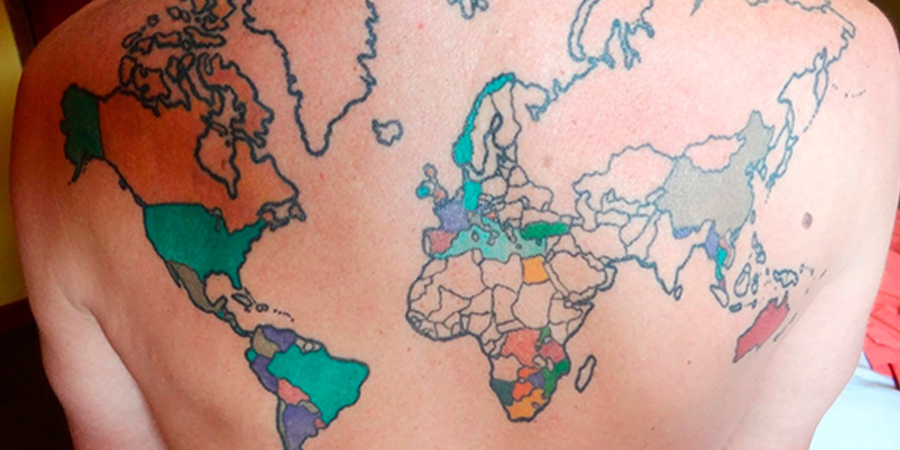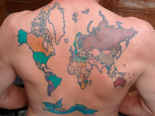 Em 2006, aos 52 anos, o americano William Passman, abandonou sua carreira como advogado para conhecer o mundo. Desde então uniou o prazer das viagens com uma tatugem incrível. Ele tatuou o mapa mundi nas costas e, conforme conhece os países que visita, vai colorindo o mapa.