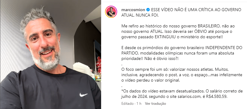 Em um vídeo publicado em seu perfil no Instagram, o apresentador do “Caldeirão com Mion” (TV Globo) lamenta as derrotas dos atletas em Paris e apresenta dados de fonte duvidosa.