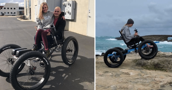Marido projeta uma cadeira de rodas off-road para sua esposa andar por onde quiser. Amor aventureiro!