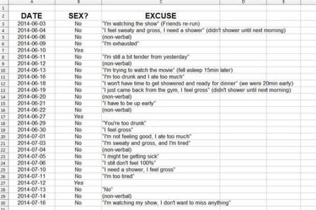 Um homem casado, cansado de ser rejeitado pela própria esposa, decidiu listar no Excel todas as vezes que ela disse “não” quis manter relações com ele e a sua respectiva desculpa.