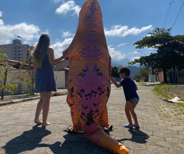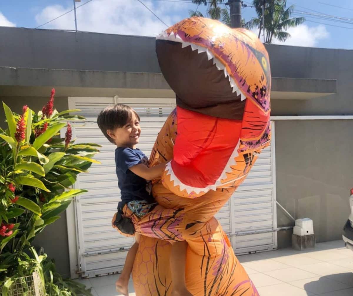 Neste fim de semana porém, a saudade apertou demais e Juan decidiu que iria ver e abraçar o filho Lucca, de 4 anos, depois de 36 dias. Mas como faria isso sem expô-lo ao risco? Usando uma fantasia de dinossauro, é claro!