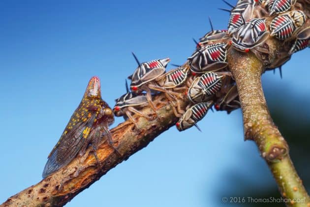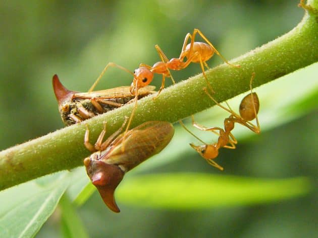 Esses insetos extraordinários perfuram os caules das plantas com seus bicos e sugam a seiva. Eles transformam o excesso de seiva em um concentrado de melada, que atrai formigas. Algumas espécies de membracídeos desenvolveram um mutualismo com as formigas que lhes dão proteção contra predadores.