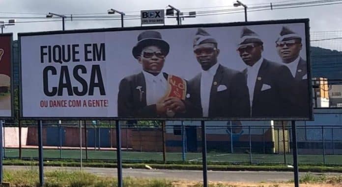 “Fique em casa, ou dance com a gente”, diz a mensagem no outdoor, acompanhada da foto dos quatros rapazes que protagonizam o vídeo que viralizou na internet.