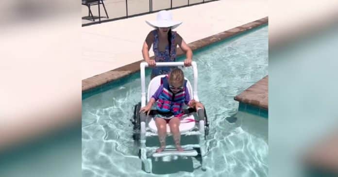 Esta adorável menina de 8 anos tem paralisia cerebral espástica tetraplégica. De acordo com sua mãe, Katrina Placzek, isso significa que ela navega pelo mundo em uma cadeira de rodas. Isso não é fácil, em grande parte, porque muitos lugares ainda não são acessíveis para crianças como ela. Por esta razão, quando Katrina viu a piscina em sua casa de férias alugada, conhecida como Tiff’s Place, ela não pôde acreditar em seus olhos!