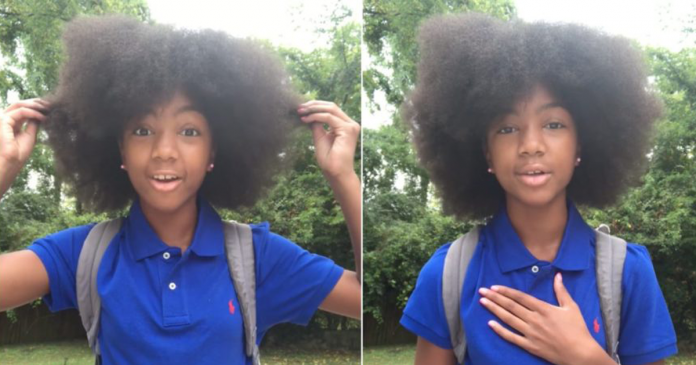 “Ontem fui à escola com o meu cabelo natural pela primeira vez e várias pessoas fizeram muitos comentários maldosos para mim. Quando voltei para casa, conversei com a minha mãe, que falou: ‘Nunca esqueça de quem você é e de onde você veio'”, a menina fala. “Então hoje eu vou voltar para a escola com o cabelo ainda maior e melhor”