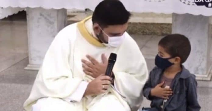 Sem hesitar, o padre imediatamente imterrompeu a celebração, àquela altura no momento da homilia, e se sentou na escada ao lado do garotinha, que contou que seu padrinho tinha sido internado com coronavírus (covid-19).