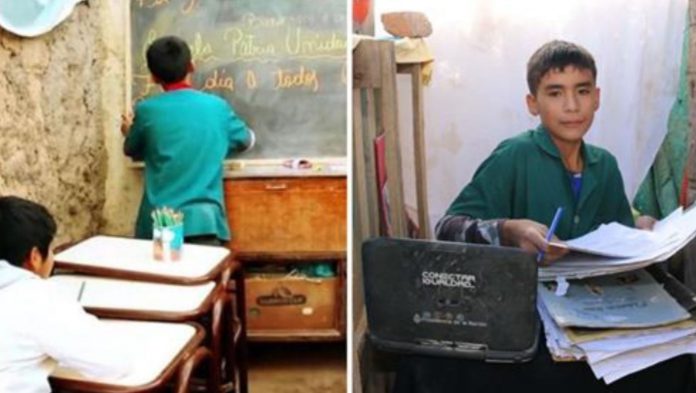 Embora tenha apenas 12 anos, o ‘professor’ Leonardo Nicanor Quinteros consegue se fazer respeitar pelos seus 36 alunos. Há alguns anos, o menino resolveu oferecer ele mesmo uma oportunidade de Educação para as crianças carentes dos bairros pobres de Las Piedritas I e II, localizados em Pocito, em San Juan (Argentina). Foi aí que ele criou a escola “Pátria e Unidade” no pátio da casa de sua avó.