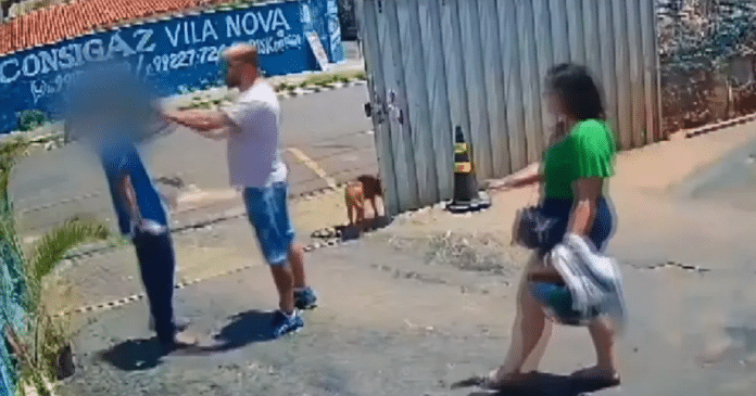 Em um momento subsequente, o adolescente e seu pai são vistos caminhando em direção à calçada, aparentemente envolvidos em uma discussão. Repentinamente, o pai usa o capacete para agredir o filho no rosto.