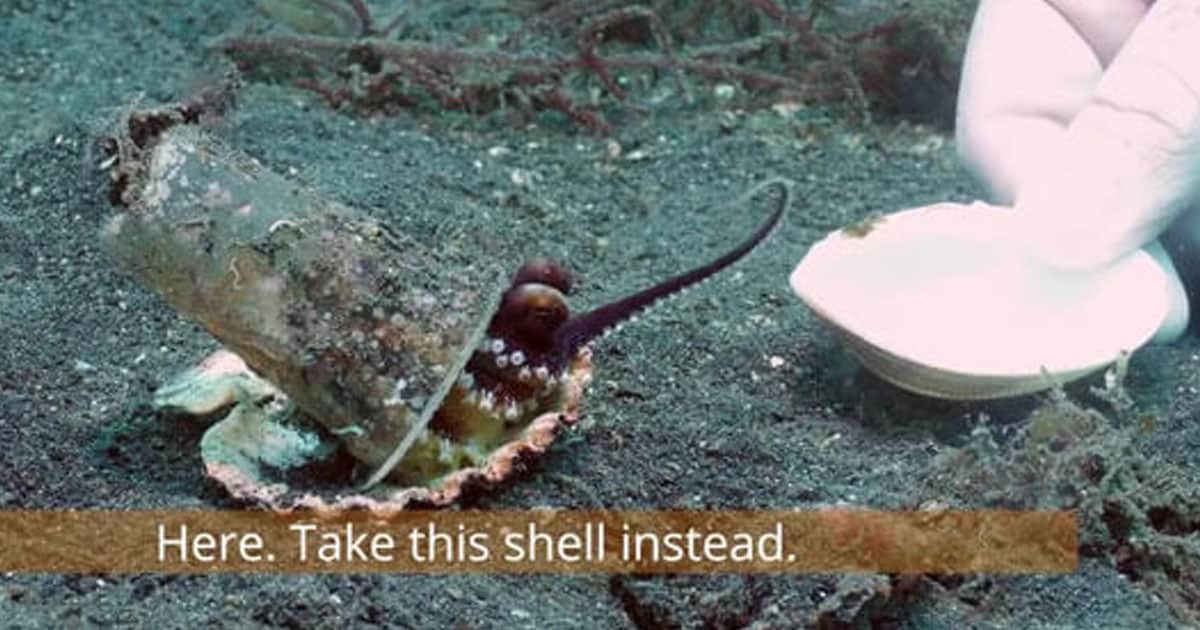 Os polvos venosos nascem com o instinto de se protegerem e procuram (por norma) conchas para fazerem delas uma casa móvel. No entanto, na ausência de materiais naturais, eles também buscam o que encontraram no fundo do oceano, como copos ou recipientes vazios de plástico.