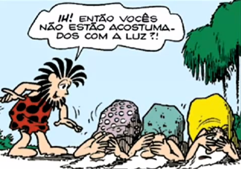 Abaixo, uma curiosa e “modernizada” versão do mito da caverna, de Platão, feita pelo criador da Mônica e do Cebolinha, o quadrinista brasileiro Maurício de Souza.