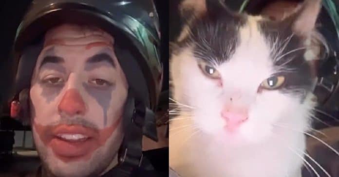 Sem hesitar, ele aceitou a proposta e, com bom humor, ainda brincou no vídeo: “Paguei vintão, paguei baratinho. Olha a carinha dele!”. O novo dono do felino mostrou o bichano, que já parecia confortável na caixa da moto.