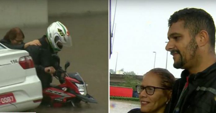 Um motociclista que passava pelo local entendeu a gravidade da situação e imediatamente conseguiu tirá-la do carro. E em seguida, o motociclista ajudou outro taxista que se arriscou no alagamento.