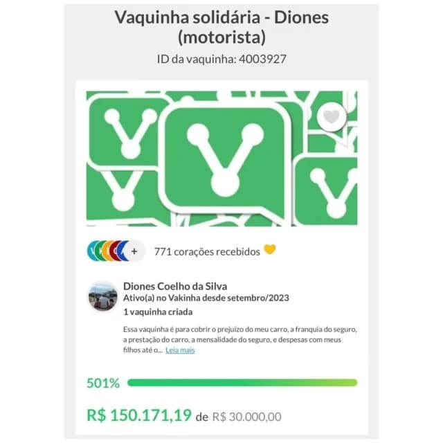 “Passando aqui para agradecer todas as doações, agradecer o apoio de cada um e tudo que vocês fizeram. E dizer que estou encerrando a vaquinha muito grato com todas as doações, pode ter certeza que vai abençoar muito a mim e a minha família. Vou conseguir voltar ao meu trabalho. Muito obrigado a cada um de vocês”, agradeceu o motorista.