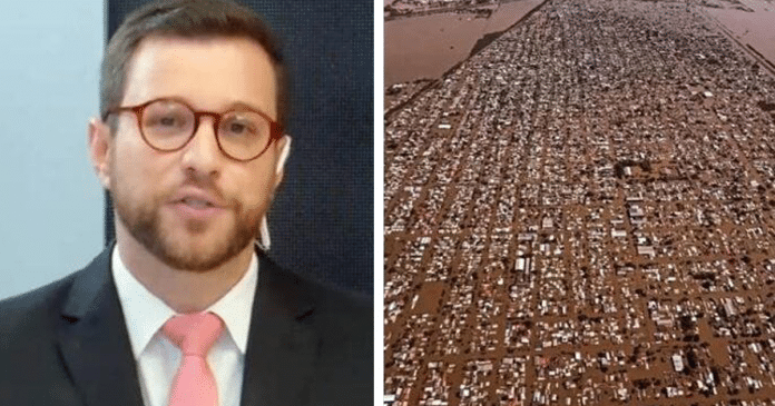 O jornalista Cassius Zeilmann, profissional do Grupo Bandeirantes de Comunicação, levantou um alerta crucial ao compartilhar uma foto chocante em suas redes sociais, retratando uma das cidades do Rio Grande do Sul submersa pelas águas das recentes chuvas que têm assolado o sul do país.