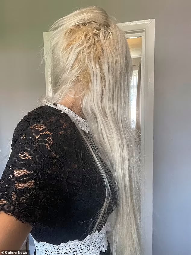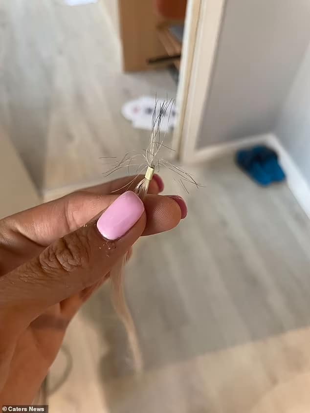 A mãe de quatro filhos afirma que, depois de lavar o cabelo, descobriu que as extensões de cabelo estavam secas, coçando e já haviam começado a cair, deixando-a com várias manchas carecas na nuca.