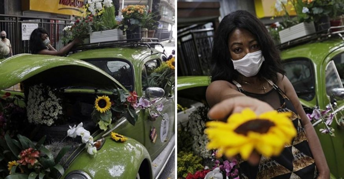 Com seu colorido jardim ambulante, a carioca percorre as ruas do Rio de Janeiro “vendendo felicidade”, como ela mesma o define. Ela garante que lhe compram muitas flores porque “falta felicidade neste estranho 2020”.