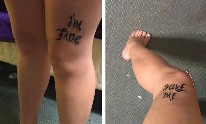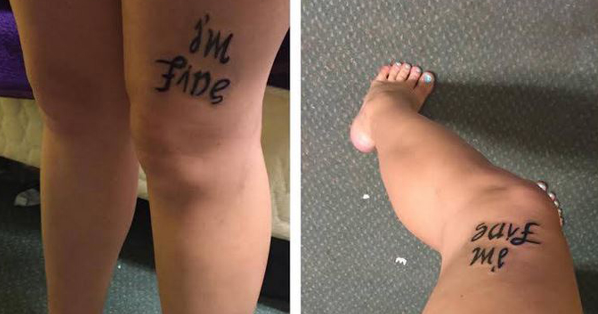 Bastou a americana Bekah Miles, 21 anos, postar sua tatuagem em sua página no Facebook para que a imagem se tornasse viral. Quem olha de frente lê “I’m fine” (estou bem). Quem vê de cima se dá conta de que a mensagem é “Save me” (me salve).