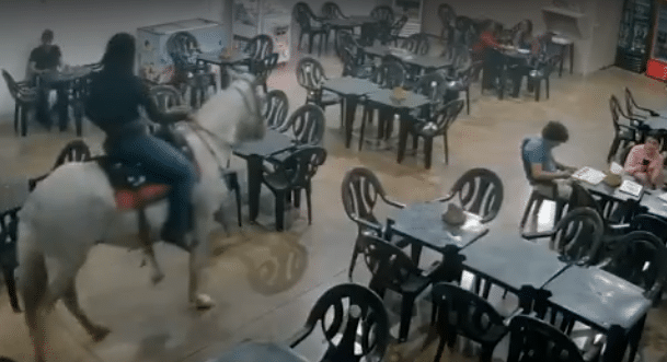 ⏯️ Na cidade de Uberaba, Minas Gerais, uma jovem montada em um cavalo entrou em uma pizzaria, gerando risadas entre os clientes.