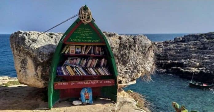 Em cala Portalga, na Itália, um antigo barco foi transformado em uma biblioteca de troca de livros, gratuita para todos, onde você pode pegar um livro e lê-lo em frente ao mar.