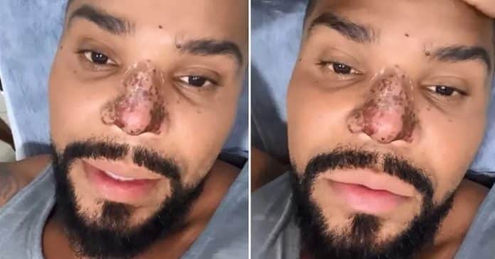 O cantor Naldo Benny compartilhou imagens em suas redes sociais que causaram preocupação em seus fãs e seguidores. O artista sofreu um princípio de necrose no nariz depois de realizar um procedimento estético.