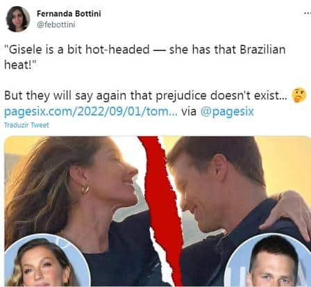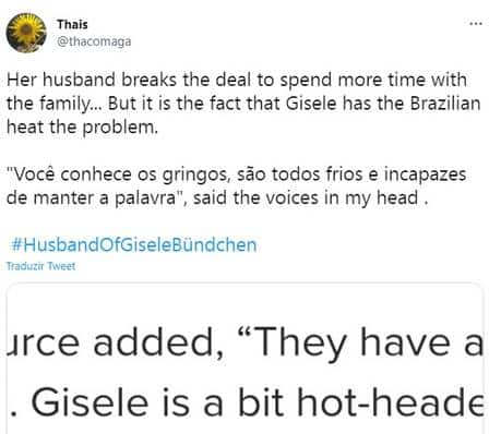 “O marido dela quebra o acordo deles de se aposentar para ficar com a família, mas é o fato da Gisele ter o ‘calor brasileiro’ que é o problema. ‘Você conhece os gringos, são todos frios e incapazes’, dizem as vozes na minha cabeça”, ironizou uma usuária do Twitter.