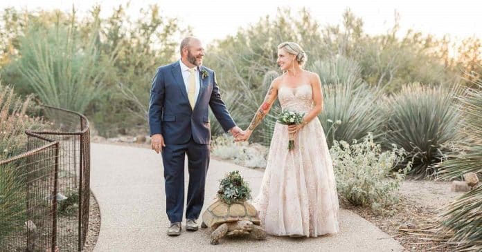 Os veterinários Ericka e Jay Johnson se conheceram enquanto faziam uma pesquisa sobre tartarugas selvagens há 20 anos, então acharam que seria uma boa ideia que sua amada tartaruga Sulcata macho, batizada como Tom Shelleck, fizesse parte da celebração de casamento.