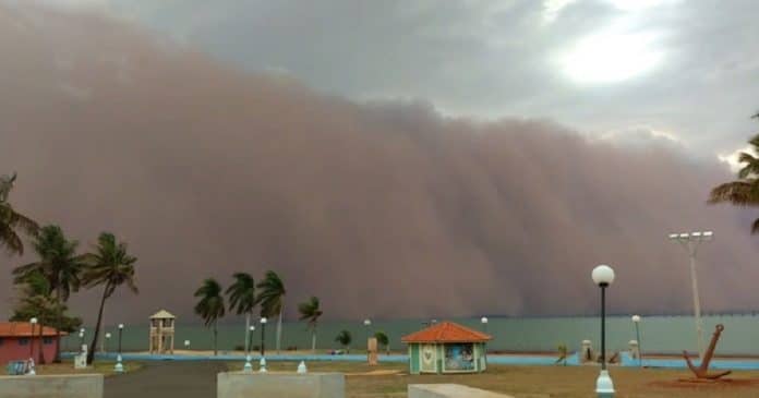 “As frentes de rajadas que se formam antes dessa tempestade chegar provocam fortes ventanias, o que, literalmente, levanta toda a poeira, mantendo esse aspecto bem escurecido dessa poeira. Quando as nuvens carregadas se formam e se juntam com toda a poeira, temos um céu bem escuro, um aspecto bem assustador”, complementa.