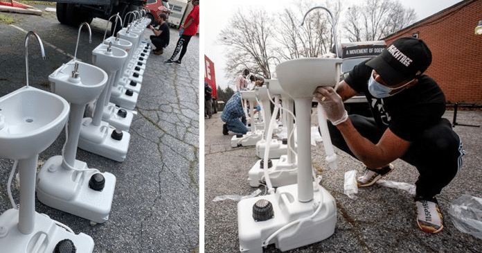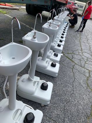 As estações portáteis de lavagem das mãos contêm 5 galões de água e um dispensador de sabão cheio de sabão conectado a elas. Os dispensadores de sabão e a água podem ser recarregados e as estações podem ser realocadas posteriormente.