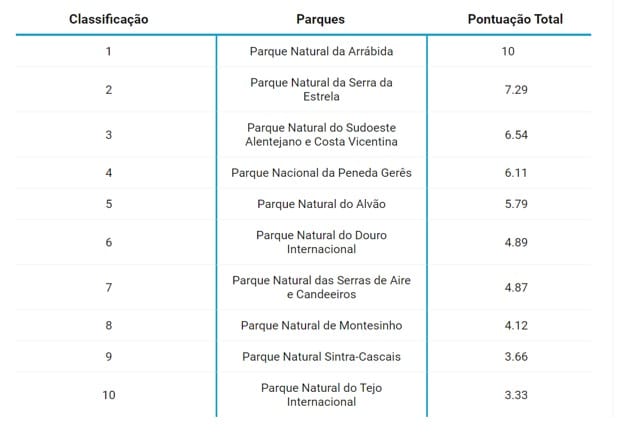 Esta classificação foi criada em outubro com base nos dados do Google Maps. Todos os parques naturais marcados como tal, foram tidos em conta. Os 10 primeiros foram elaborados com base no número de reviews no Google, a classificação e o volume de pesquisa. Com estes números e valores criou-se, então, uma classificação final dos melhores parques naturais em Portugal. Os empates foram resolvidos através da verificação na quantidade de comentários.
