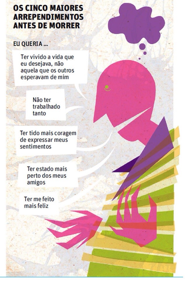 Abaixo, através da ilustração, estão citados os 5 maiores arrependimentos que as pessoas costumam mencionar antes de morrer.